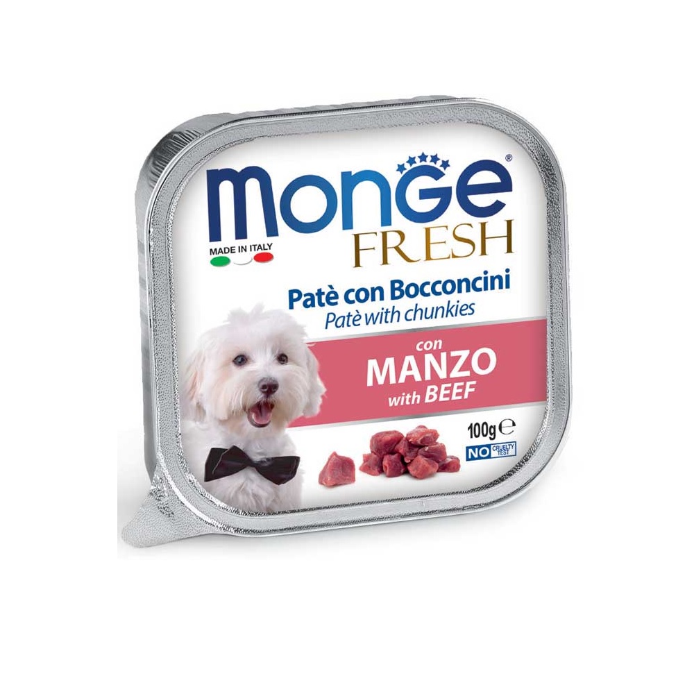 Il delizioso paté con prelibati bocconcini di manzo fresco è un alimento completo selezionato per supportare ogni giorno il benessere quotidiano del vostro animale. La ricetta è stata formulata con un basso tenore di zuccheri e senza grassi idrogenati. Il gustoso e morbido paté con bocconcini è ideale per cani di piccola taglia e come premio per cani più grandi. Monge Fresh è Made in Italy, No Cruelty Test e senza coloranti e conservanti.